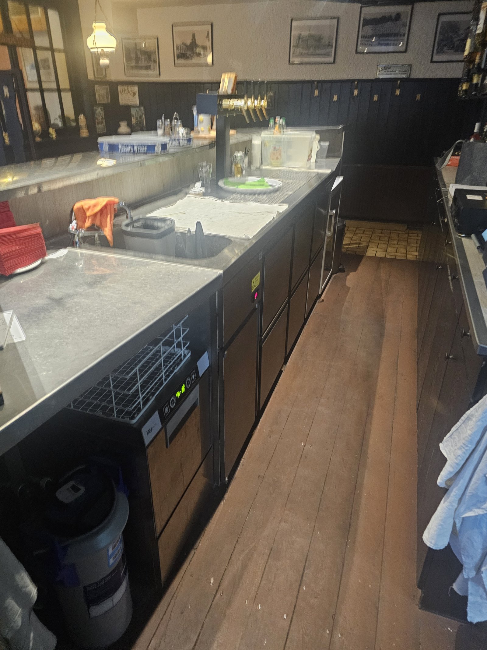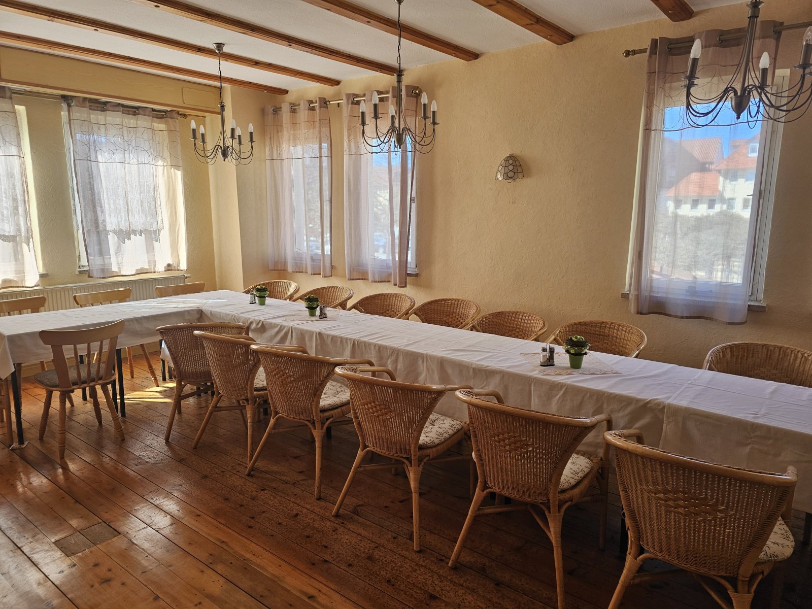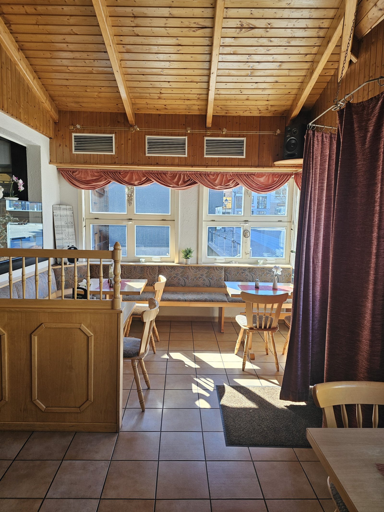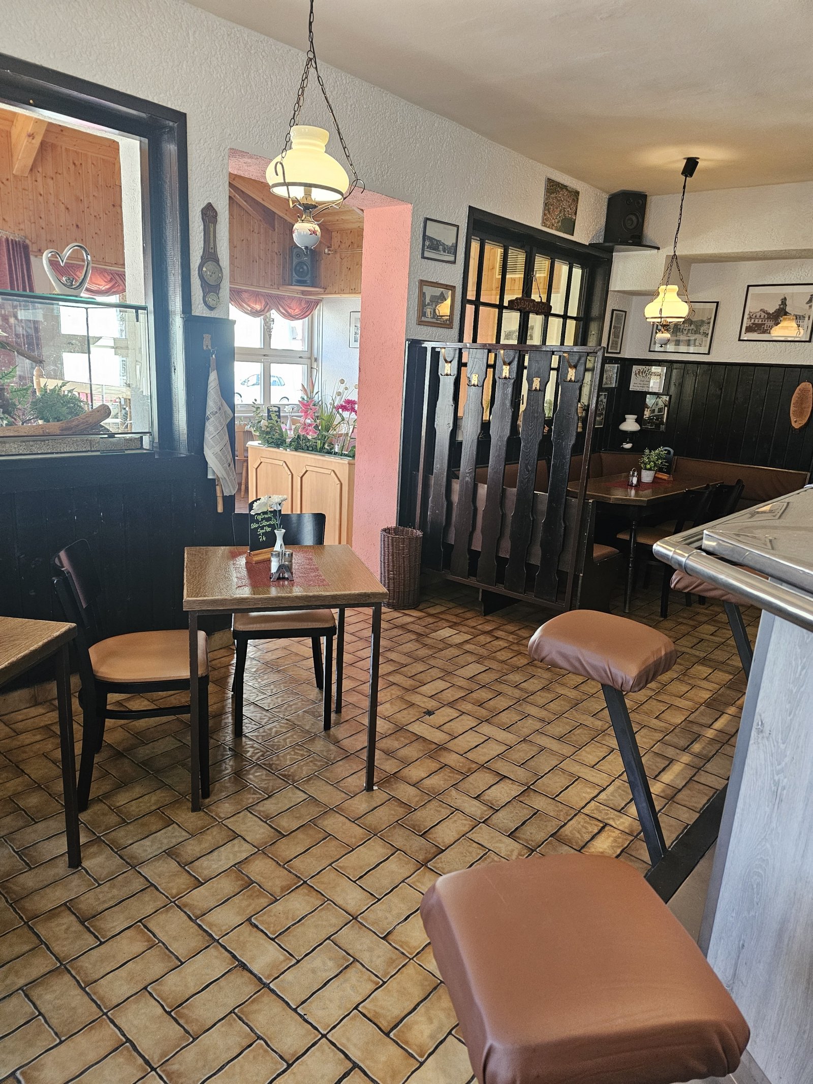 Die stilvollen Dielen und Fliesen als Bodenbeläge sind nicht nur pflegeleicht, sondern verleihen dem Raum auch eine harmonische und warme Ausstrahlung. Die Dielen bringen eine natürliche Eleganz und sind angenehm fußwarm, während die Fliesen robust und pflegeleicht sind, was in einem Gastronomiebetrieb von großer Bedeutung ist. Die Zentralheizung mit Gasbefeuerung sorgt für eine effiziente und gleichmäßige Wärmeverteilung, die auch an kalten Tagen eine behagliche Atmosphäre schafft.