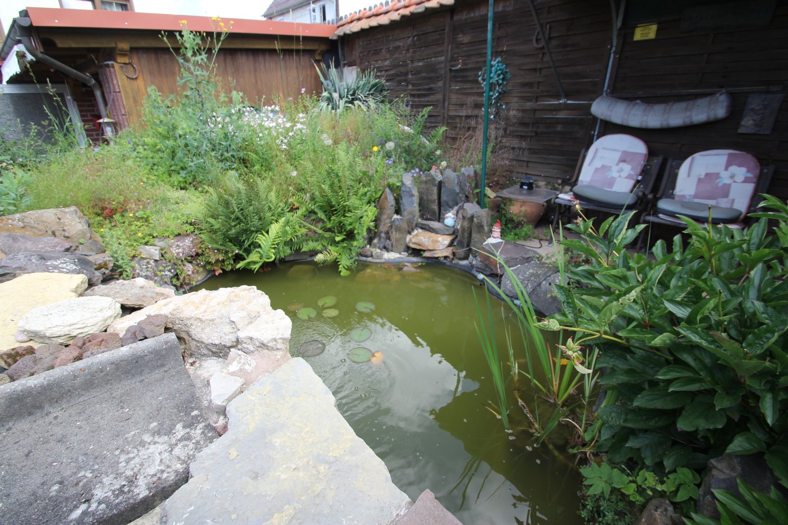 Im Garten wurde ein sehenswerter Gartenteich integriert und die Terrasse ermöglicht ein geselliges Beisammensein.
